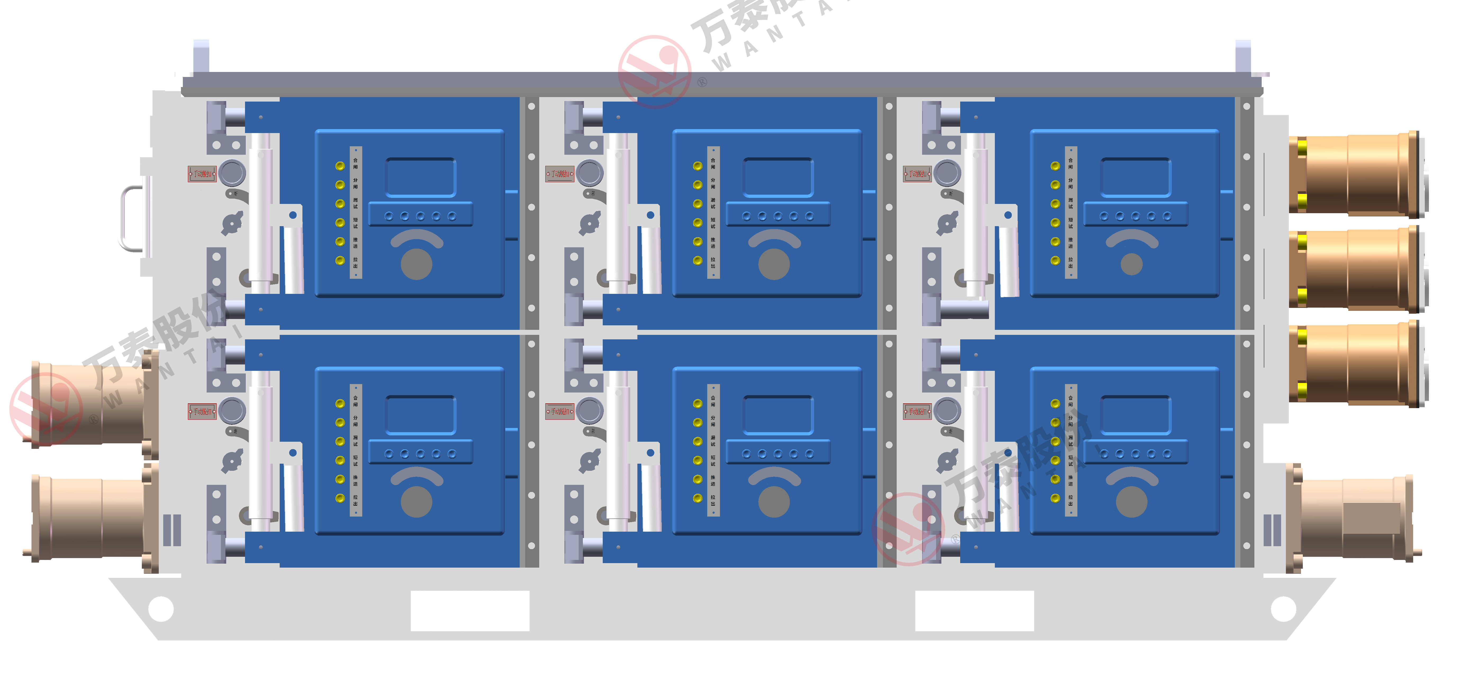 2、伺服推進(jìn)機(jī)構(gòu):能夠電動(dòng)對(duì)各饋電本體進(jìn)行推進(jìn)和拉出。并配備手搖功能,真正實(shí)現(xiàn)電源隔離,供電更安全;