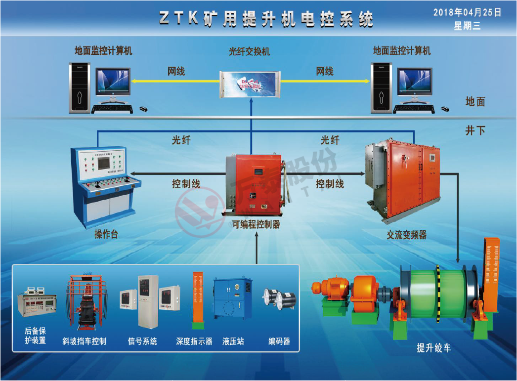 ZTK礦用提升機電控系統(tǒng)是利用BPJ1礦用隔爆兼本質安全型交流變頻器,針對井下斜巷絞車、無級繩絞車提升運輸?shù)膽?,同步開發(fā)了配套可編程控制器、現(xiàn)場傳感器,組成了一個集拖動、控制、操作、現(xiàn)場檢測一體的電控系統(tǒng),形成了一套驅動以交流變頻器,控制以可編程控制器為核心的電控系統(tǒng)(以下簡稱電控裝置)。