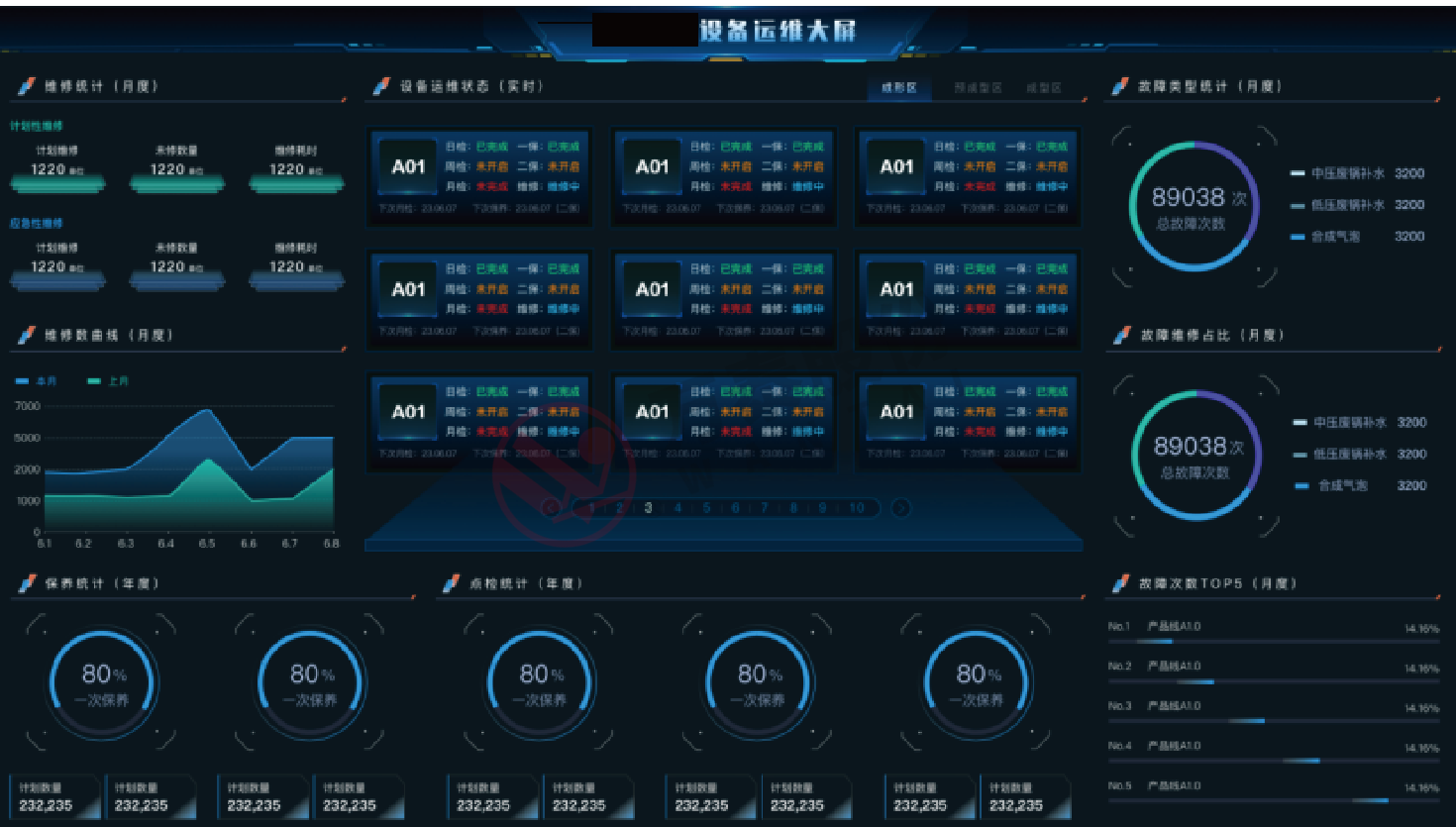 設(shè)備運維大屏展示功能:統(tǒng)計當(dāng)前煤礦重點設(shè)備在維保設(shè)備的數(shù)量,維保的進(jìn)度(已完成/未完成),顯示每臺設(shè)備的維保任務(wù)及每臺設(shè)備維保的時長。統(tǒng)計當(dāng)前設(shè)備維保人員總數(shù),當(dāng)前正在維保人員人數(shù),每個維保人員已維保及待維保的設(shè)備的數(shù)量,每個人員已維保及待維保任務(wù)數(shù),維保時長。
