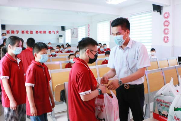萬泰愛心基金會成員與孩子們親切交流,關切地詢問孩子們學習情況,并把節(jié)日的禮物送到孩子們的手中,祝孩子們節(jié)日快樂,并勉勵孩子們要好好學習、增強本領,長大后努力為社會作貢獻。